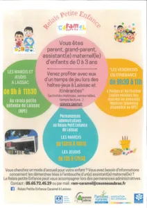 Le Relais Petite Enfance "Caramel" vous propose des haltes-jeux à Laissac les mardis et jeudis de 9h à 11h30 et des haltes-jeux itinérantes les vendredis à Bertholène et à Palmas de 9h à 11h pour un temps d'échange et d'éveil à destination des tout-petits de 0 à 3 ans accompagnés d'un adulte (assistant(e) maternel(le), parent, grand-parent).